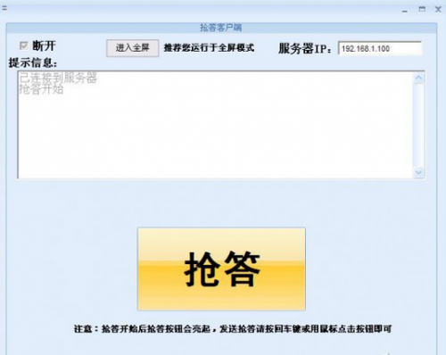 在客户端电脑上运行Client.exe程序后,客户端程序界面进入全屏状态,点击“退出全屏”按钮返回普通模式,推荐配置好参数使用全屏模式,这样可以避免选手点击程序界面以外的区域而影响比赛。在“服务器IP”后输入抢答服务器电脑的IP地址:192.168.1.100(图2)。随后点击勾选左上角的“连接”选项,就会与抢答器服务器连接成功,“连接”选项变成了“断开”选项,并在中部“提示信息”框中显示“已连接到服务器”信息。使用同样的设置方法,将所有抢答客户端配置好,并都与抢答器服务器连接成功。此时参赛队电脑上的“抢答客户端”界面中的“抢答”按钮还处于不可用状态,选手还不能抢答(图2)。
