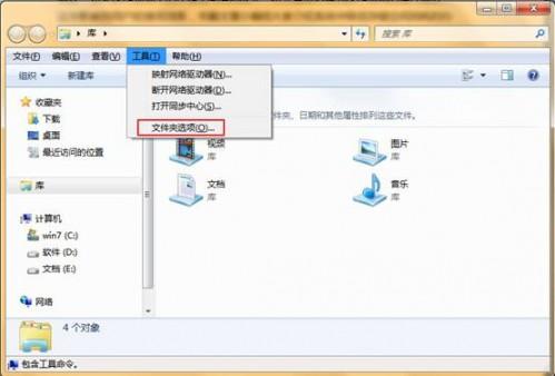 1、打开任意一个文件夹,然后点击上方的“工具”,然后在弹出的菜单中选择“文件夹选项”,如下图所示: