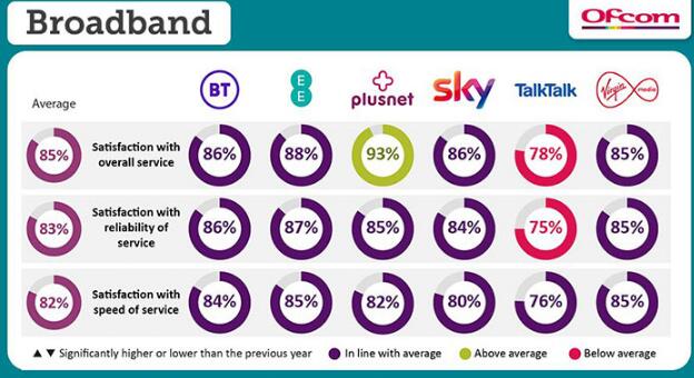 TalkTalk的整体评分最差,是最差的。它的许多客户对可靠性和速度都不满意,但是如上所述,至少可以很快接到客户服务电话。有趣的是,它每10万订户中收到87个Ofcom投诉,比第一名Plusnet(100)好。看起来TalkTalk的弱点可能部分归因于对投诉处理的满意度,这是最低的,为44%(同样,相比之下,Plusnet的投诉处理满意度为52%)。