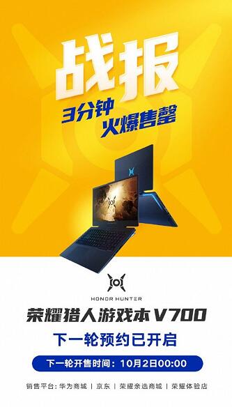 根据官方的荣誉报告,所有Hunter V700都在3分钟内售罄。下一批笔记本电脑将于10月2日在中国上市。该公司没有透露首批产品的数量,但通常涉及移动PC时,大约为10,000台。